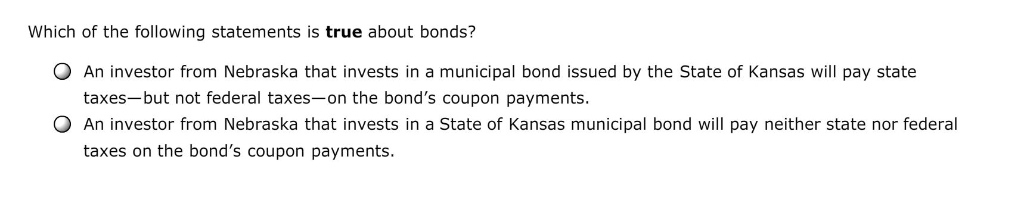 Which of the following is not a true statement regarding municipal bonds. All of the statements are false Some states are considered Community Property states. Which of the following statements istrue regarding a corporate bond.